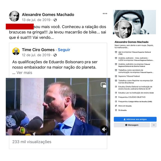 Uma das postagens nas redes sociais do sujeito chegou a ser excluída do Facebook porque alegava falsamente que a mulher do premiê do Canadá ironizou uma indicação de Eduardo Bolsonaro (PL-SP) para a embaixada brasileira nos Estados Unidos.