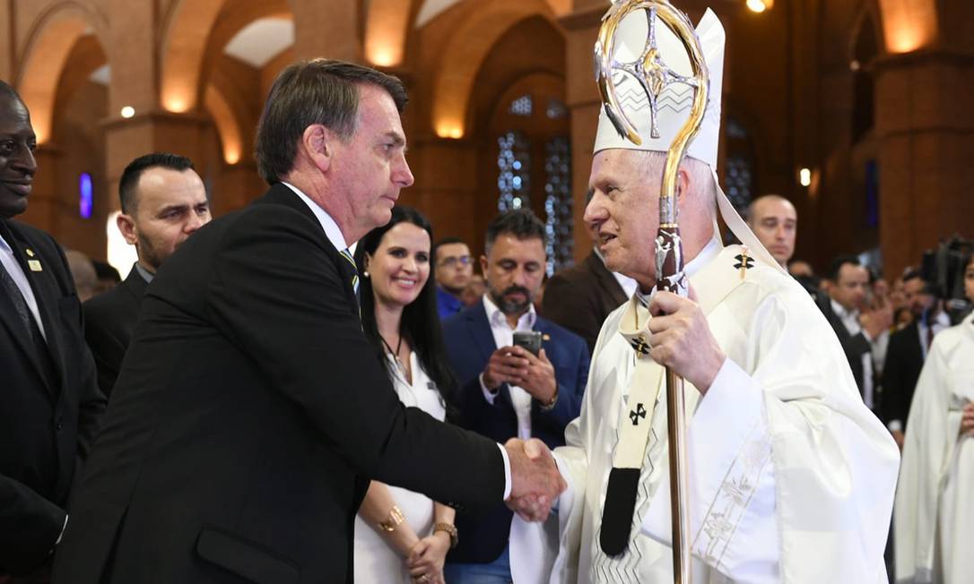 Bolsonaro cumprimenta o arcebispo Orlando Brandes na missa de Nossa Senhora Aparecida