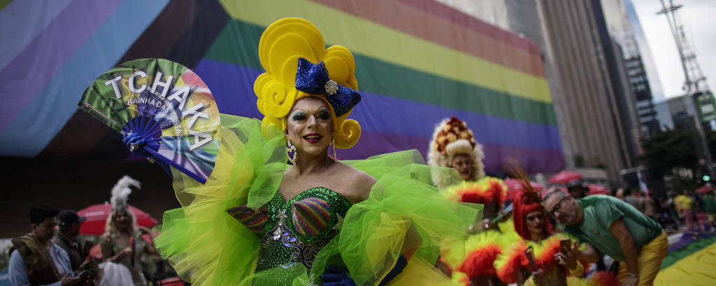 A musa da Parada, a drag queen Tchaka, abriu o evento usando um vestido de tule verde e uma peruca amarela. “O Brasil é dos LGBTs, a bandeira é nossa, é tudo nosso”, disse Tchaka, saudando a multidão pelo uso das cores verde e amarelo.