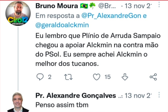 Antes de o tucano optar por Lula, Gonçalves cravou que ele seria “um bom vice”. “Nunca chamei ele de ladrão”, escreveu. Mais: concordava que Alckmin era “decente”, “respeitável”, “um democrata”.