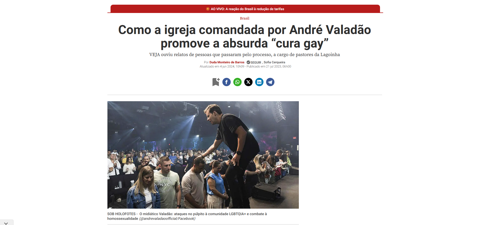 O texto também relatava a existência de um ritual de “cura gay” em retiros ligados à igreja. Ao analisar vídeos anexados ao processo, o juiz afirmou que a revista “não publicou qualquer inverdade”. Como consequência, Valadão foi condenado a pagar honorários calculados sobre o valor que ele próprio havia pedido como indenização.