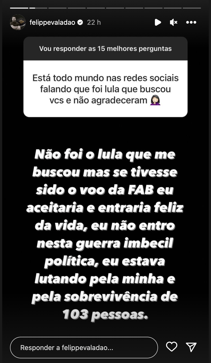 Em seu Instagram, Valadão gravou um vídeo agradecendo “a pessoa responsável por ativar a Força Aérea Brasileira. Tem gente achando que é o Lula que está fazendo isso, mas não é não. Eu posso falar porque participei dessa reunião: é o deputado Áureo”.
