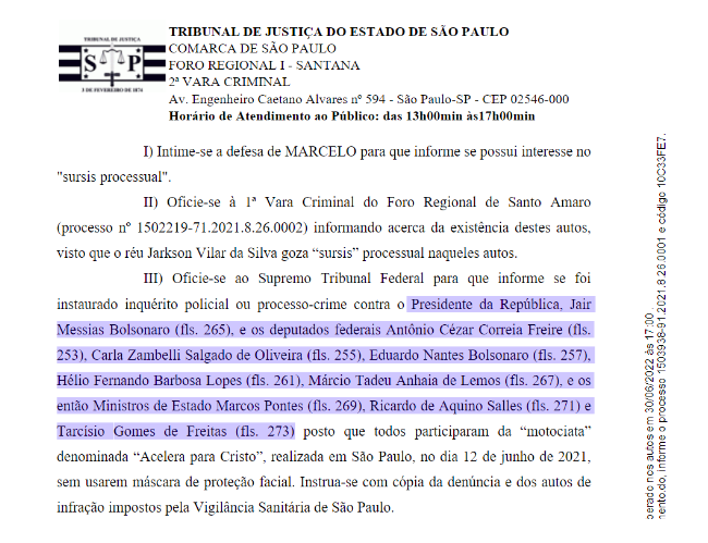 Assim, no último dia 30, a juíza Cristina Alves Biagi Fabri, da 2ª Vara Criminal de Santana, determinou que se oficie o Supremo Tribunal Federal (STF) informando a respeito dos atos investigados, para que se verifique se já existe inquérito em andamento para que Bolsonaro e os outros políticos possam ser também denunciados no foro devido. Veja trecho da decisão abaixo.