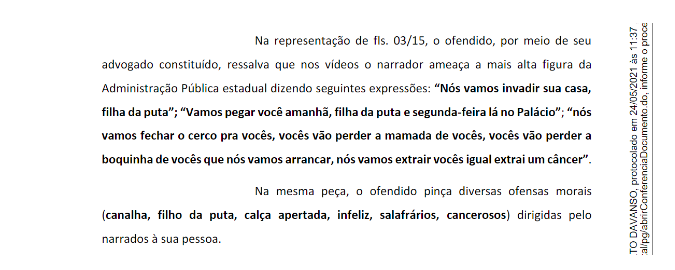 Nós vamos invadir sua casa, filha da puta”; “Vamos pegar você amanhã, filha da puta e segunda-feira lá no Palácio”; “nós vamos fechar o cerco pra vocês, vocês vão perder a mamada de vocês, vocês vão perder a boquinha de vocês que nós vamos arrancar, nós vamos extrair vocês igual extrai um câncer.
