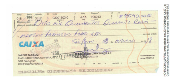 Em outro (processo número 1060859-95.2019.8.26.0002), a condenação é por ter dado calote na gráfica que fez os “santinhos” de sua campanha derrotada a deputado federal em 2018. Ele passou seis cheques, totalizando um valor de R$ 62 mil. Todos foram devolvidos porque não tinham fundos (veja a imagem de um deles, abaixo). Até a publicação desta reportagem, Jackson Vilar ainda não tinha pagado o que devia.