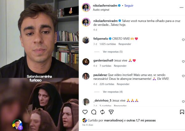 Já no último domingo (5), logo depois de Eduardo Bolsonaro ter atacado o deputado federal nas redes sociais, Michelle compartilhou um vídeo de Nikolas sobre o filme “Paixão de Cristo” (2004), em que o parlamentar discorre sobre como Satanás, com toda sua fúria e maldade, se colocou contra Jesus no deserto.