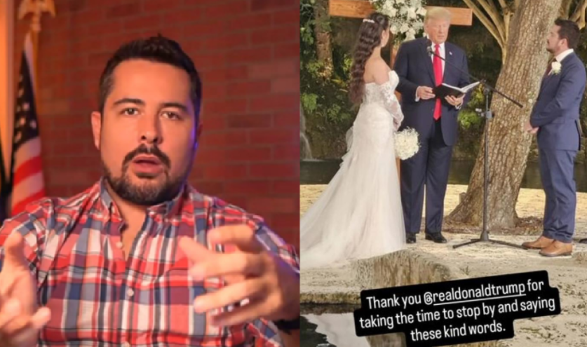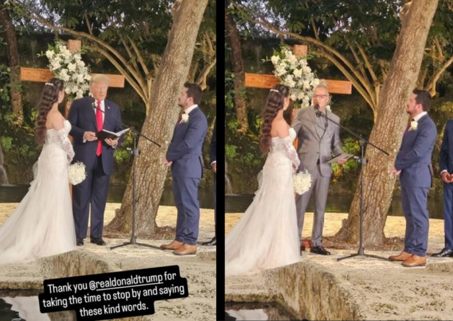 🫂A presença do presidente Trump no casamento de Paulo Figueiredo ganhou destaque nas redes na noite deste sábado. O jornalista publicou imagens do momento em que Trump aparece diante do casal, com microfone e livro em mãos, fazendo um breve discurso durante a… pic.twitter.com/HAQza9sfRX