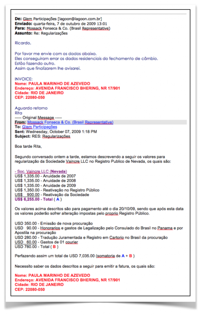 De acordo com o levantamento, Paula recebeu e pagou faturas relativas a 3 offshores mantidas pela Mossack Fonseca criadas em 2005 e reativadas por Alexandre Chiappetta de Azevedo em 2009.