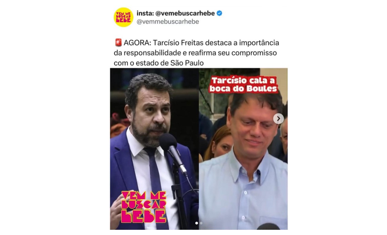 Perfil Vem Me Buscar Hebe elogia Tarcísio e ataca Boulos