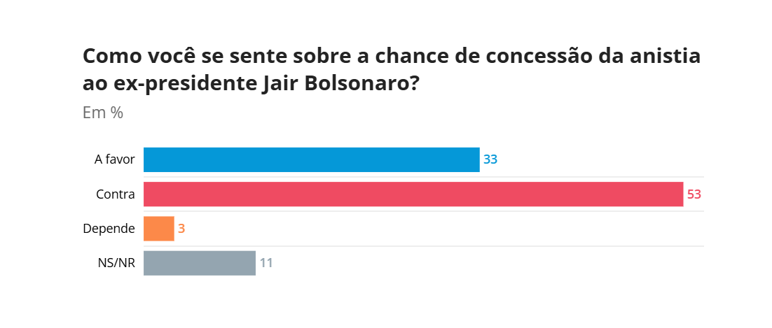 Perguntados sobre a possibilidade de anular a condenação, 53% rejeitaram essa hipótese, enquanto 40% disseram ser favoráveis. O levantamento também mediu a percepção sobre uma eventual anistia ao ex-presidente, tema discutido no Congresso. Nesse cenário, 33% apoiam e 53% se opõem.