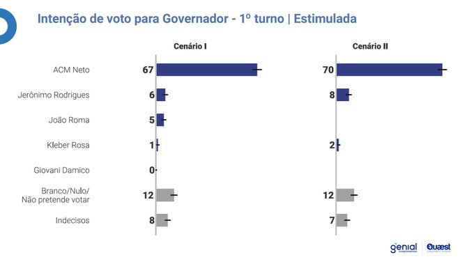 De acordo com a nova pesquisa Genial/Quaest, divulgada na manhã desta quarta-feira (18), o ex-prefeito de Salvador ACM Neto deve vencer no primeiro turno a eleição para governador da Bahia.