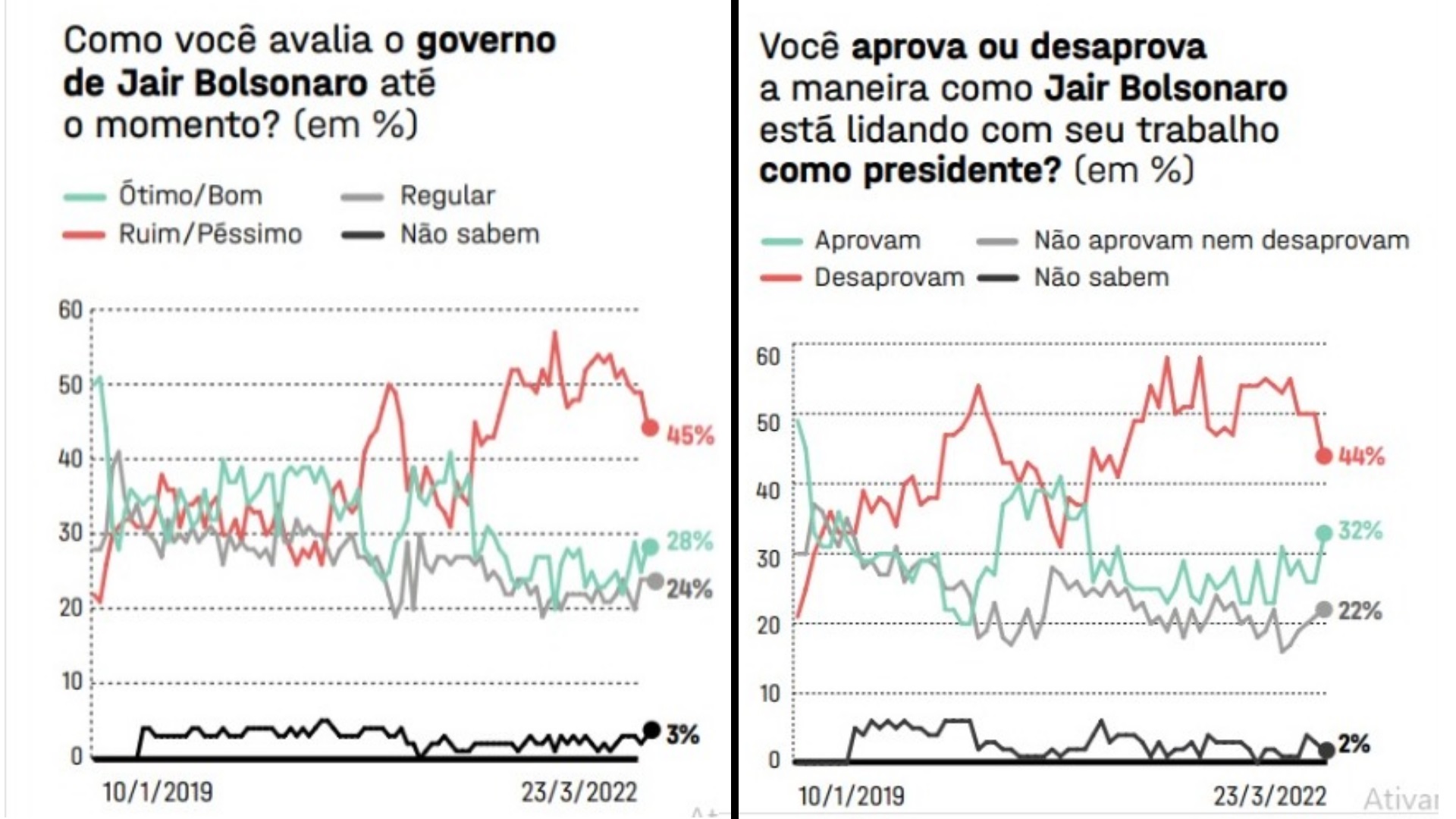 A maneira como Bolsonaro está lidando com seu trabalho como presidente também recebe uma alta reprovação. 44% desaprovam, contra 32% a favor e 22% em cima do muro.