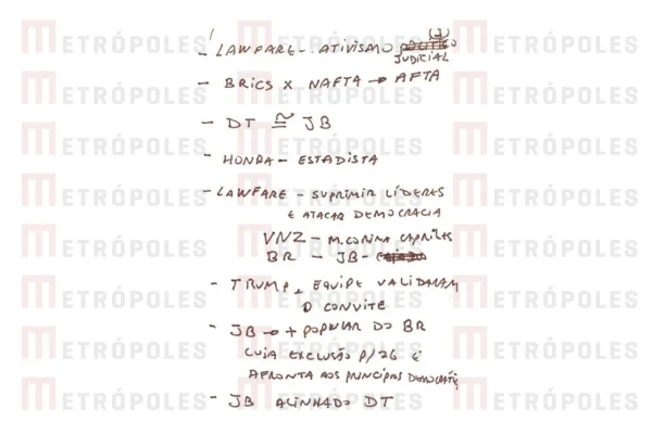 Outra anotação traz o termo “Lawfare — ativismo judicial”, expressão usada por apoiadores de Bolsonaro para denunciar o que consideram o uso político do sistema de Justiça. O ex-presidente frequentemente recorreu a esse argumento ao afirmar ser vítima de perseguição judicial.