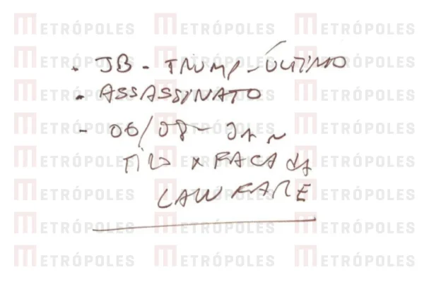 Entre os registros também aparece a frase “JB – + popular do BR cuja exclusão p/26 é afronta aos princípios democráticos”, que, segundo investigadores, pode se referir à inelegibilidade imposta pelo Tribunal Superior Eleitoral (TSE).