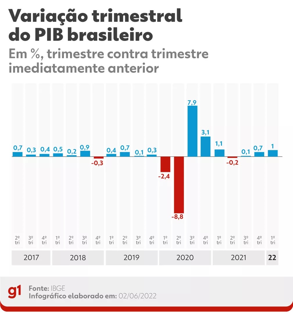 Segundo dados divulgados pelo IBGE (Instituto Brasileiro de Geografia e Estatística) nesta quinta-feira (2), o PIB (Produto Interno Bruto) do Brasil cresceu 1% no primeiro trimestre de 2022, em comparação com os três meses anteriores.