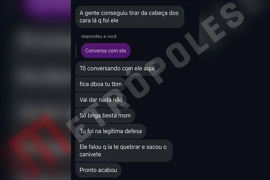 Em um dos trechos, o contato afirma que “conseguiu tirar da cabeça dos caras que foi ele”, sugere tranquilidade ao investigado e reforça que “vai dar nada não”. Na sequência, direciona explicitamente a versão a ser apresentada: “Tu foi na legítima defesa”, finalizando com a afirmação de que a vítima estaria armada com um canivete.