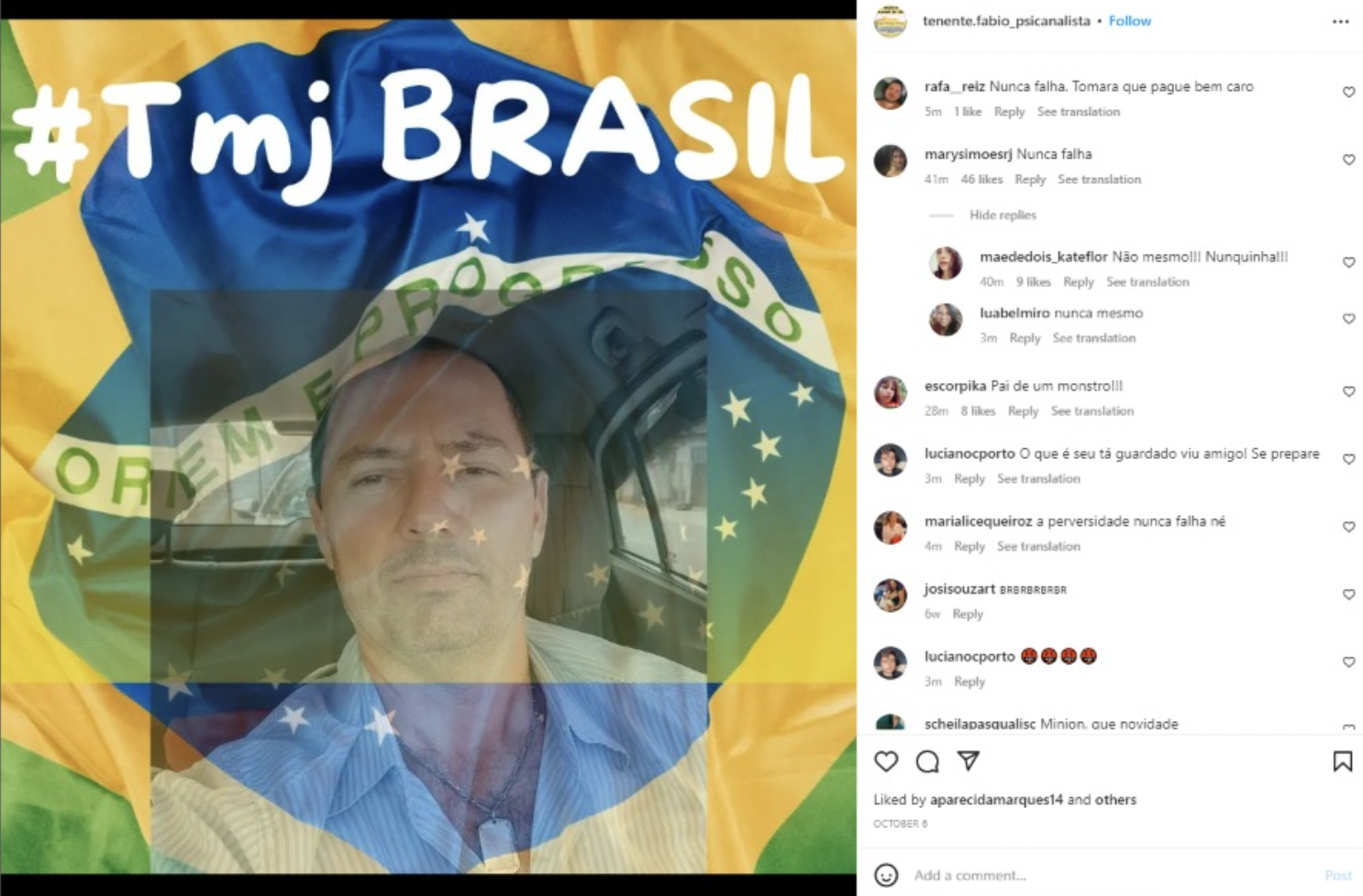 A maioria das postagens são de cards com design amador divulgando os trabalhos terapêuticos. Não haveria nenhuma referência política se não fosse um post com a bandeira nacional estilizada e a legenda “#TMJ Brasil”, indicando a predileção partidária do militar.