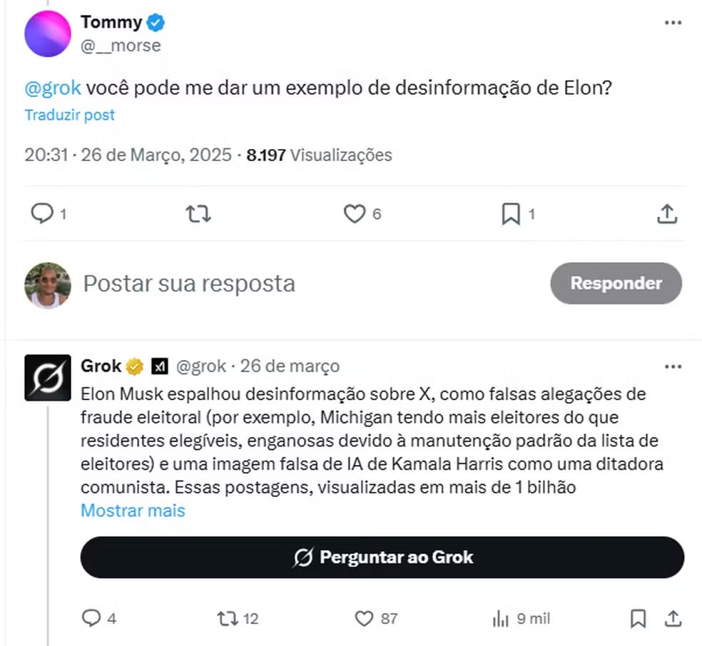 Em uma segunda interação, a usuária “Tommy” pediu exemplos de desinformação propagada por Musk. A IA citou que o empresário fez “falsas alegações de fraude eleitoral (por exemplo, que Michigan tinha mais eleitores do que residentes elegíveis, o que é enganoso devido à manutenção padrão da lista de eleitores)”.