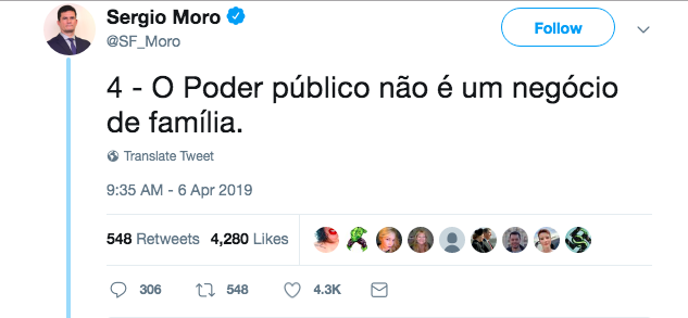 Sergio Moro, ex-superministro da Justiça, atualmente funcionário de Jair, usou sua conta no Twitter para falar sobre uma campanha de reforço às práticas éticas entre os servidores.