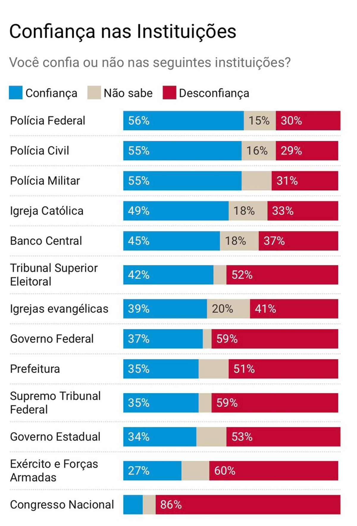 Na outra ponta, o Congresso Nacional apresenta o pior desempenho, com apenas 9% dos entrevistados afirmando confiar no Parlamento e 86% declarando desconfiança. O Supremo Tribunal Federal (STF) também registra maioria de percepção negativa, com 35% de confiança contra 59% de desconfiança. O governo federal segue a mesma tendência, com 37% de avaliações positivas e 59% negativas.
