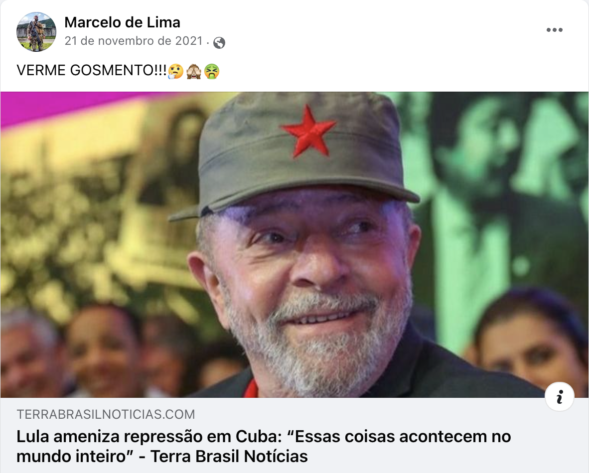 Espalha fake news e teorias conspiratórias. Queixou-se de ter sua conta do Instagram suspensa e atribuiu à “ditadura do politicamente correto”. É negacionista da vacina e diz que Lula roubou a eleição. Ataques aos ministros do STF Alexandre de Moraes e Luís Roberto Barroso são comuns.