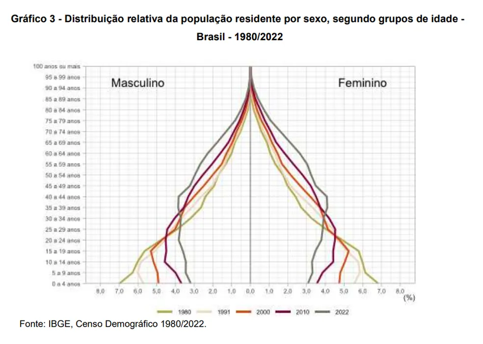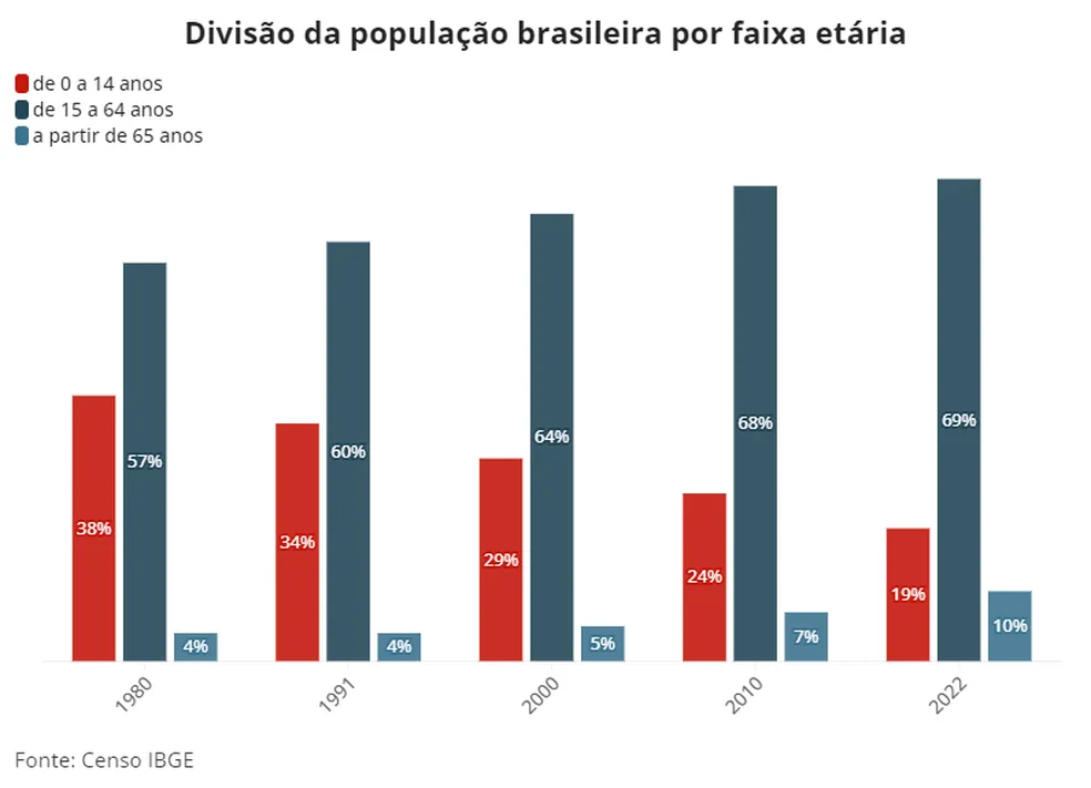 O número total de crianças (0 a 14 anos) teve um recuo entre 2010 e 2022, passando de 24,1% da população para 19,8%. Em 1980, segundo o levantamento, essa faixa etária representava 38,2% do total da população e os mais idosos apenas 4%.