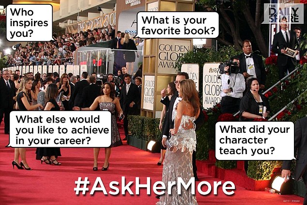 E uma campanha com o slogan #AskHerMore (“pergunte mais a ela”) foi encampada pela comediante Amy Poehler, apresentadora da última edição do Globo de Ouro e estrela do seriado Parks and Recreation. A campanha foi usada em premiações recentes pelo site The Daily Share para estimular perguntas mais inteligentes vindas dos espectadores.