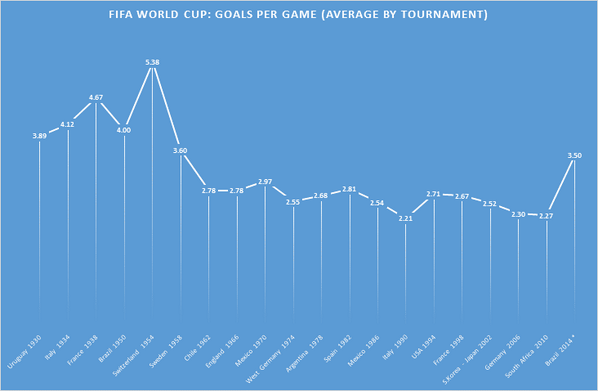 Isto faz da Copa no Brasil a mais prolífica da era moderna. Itália 1990 continua a ser a que teve a mais baixa média, com reles 2,21 gols por jogo.