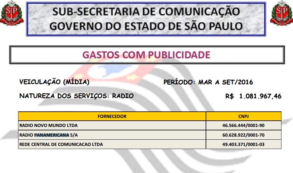 No mesmo ano de 2016, quando recebeu mais de R$ 1 milhão com publicidade na internet, a Rádio Jovem Pan amealhou R$ 2.365.792,32 do governo Alckmin entre janeiro e março de 2016 em conjunto com as emissoras Novo Mundo e Central de Comunicação.