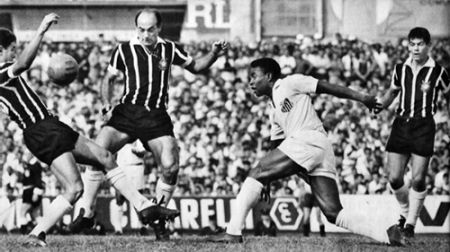 Naquele domingo, num Morumbi ainda sem o anel completo, e com Clóvis fixo nele, vi encantado e horrorizado Pelé deixar subitamente o grande zagueiro paralisado. Pelé estava no lado esquerdo, perto da linha do meio de campo, e Clóvis atrás dele. Um jogador do Santos esticou, lá de trás, a bola em linha reta para Pelé. Ele não tinha espaço, não tinha ação, não tinha o que fazer de perigoso com Clóvis, vigilante como um segurança de boate, atrás dele. Mas para surpresa de todos nós, e talvez dele mesmo, Pelé, quando a bola chegou a ele abriu as pernas e saiu correndo atrás dela, que passara invisível pelas pernas de Clóvis. Pelé apanhou a bola já perto da área do Corinthians, pela esquerda, avançou com suas passadas atléticas até a pequena área e, na saída do goleiro, rolou-a, generoso, para Coutinho, que vinha de trás e apenas a empurrou para dentro. Quando Clóvis, um ótimo zagueiro, entendeu finalmente o que estava ocorrendo, a bola já estava na rede.