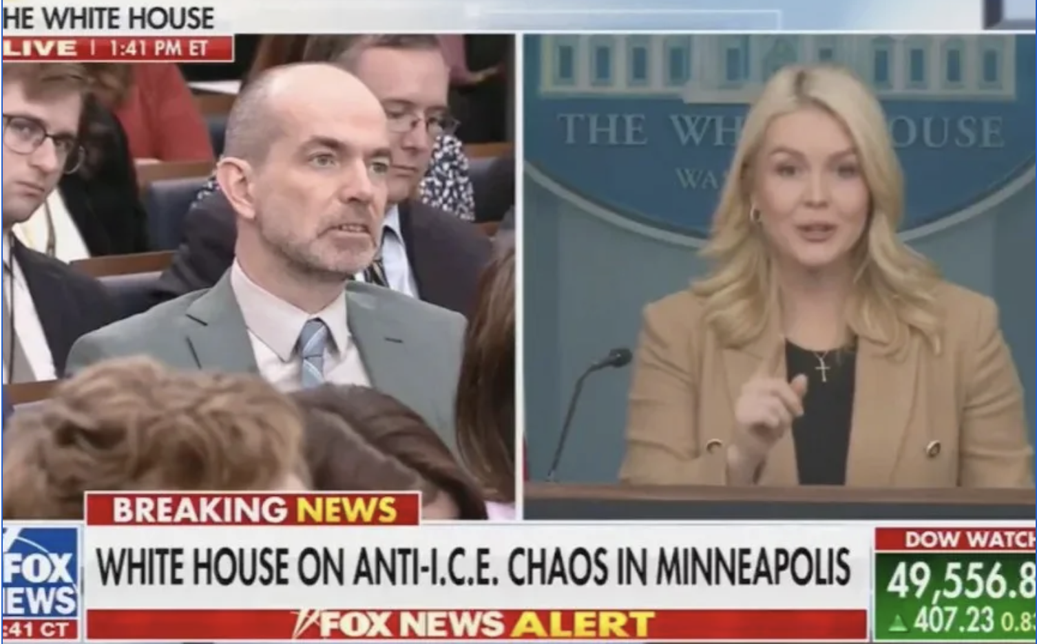 Niall Stanage, do site The Hill, havia apresentado fatos recentes sobre o ICE e pedido uma resposta da secretária de imprensa. Após a declaração de Noem de que “cada ação que nossos agentes do ICE tomam está de acordo com a lei e seguindo os protocolos que usamos há anos… Eles estão fazendo tudo corretamente”, o repórter perguntou a Leavitt se as 32 mortes de pessoas sob custódia do ICE em 2025, os 170 cidadãos dos EUA detidos pelo ICE e a morte de Renee Good na semana passada seriam considerados “fazer tudo corretamente”.