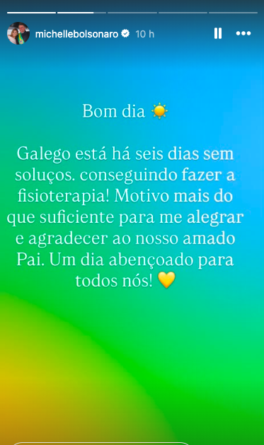 A ex-primeira-dama Michelle Bolsonaro fez uma declaração otimista sobre a saúde do marido, o ex-presidente Jair Bolsonaro. Em uma postagem no Instagram no sábado (4), Michelle afirmou que Bolsonaro está há seis dias sem soluços e já consegue realizar sessões de fisioterapia, comemorando sua recuperação. A ex-primeira-dama expressou sua gratidão a Deus e se referiu a Bolsonaro como “galego”, mencionando que essa evolução médica é motivo de grande alegria para a família.