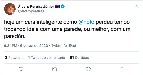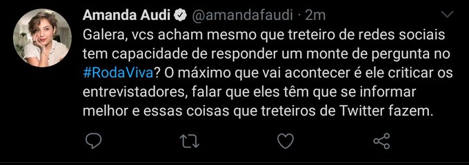 Amanda Audi, do Intercept, chamou Jones de “treteiro do Twitter” e questionou sua capacidade de “responder um monte de pergunta no Roda Viva” — como se aquela coisa que já teve Augusto Nunes de apresentador e Marcelo Tas na bancada fosse algo incrível.