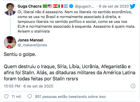 “Nem os liberais no sentido econômico, como se usa no Brasil e normalmente associado à direita, e tampouco liberais no sentido político e social, como se usa nos EUA e normalmente associado à esquerda. Assassino é quem mata. Avisem o stalinista”.