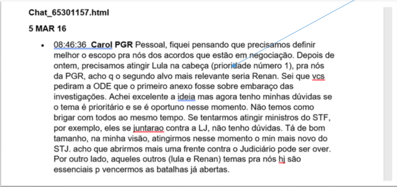 “Pessoal, fiquei pensando que precisamos definir melhor o escopo pra nós dos acordos que estão em negociação. Depois de ontem, precisamos atingir Lula na cabeça (prioridade número 1), pra nós da PGR, acho q o segundo alvo mais relevante seria Renan”, escreve.