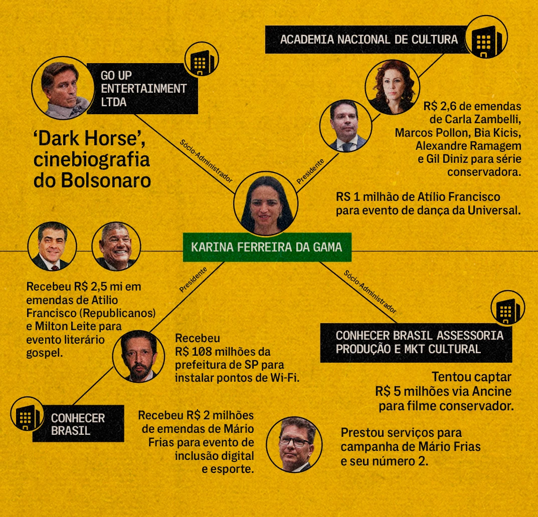 Ela é presidente do Instituto Conhecer Brasil (ICB), que assinou um contrato com a gestão de Ricardo Nunes, do MDB, após ser a única empresa a apresentar proposta em uma licitação de julho de 2024. Ao mesmo tempo, Karina também gerencia a Go Up Entertainment, produtora do filme Dark Horse, que narra a ascensão de Bolsonaro à presidência.