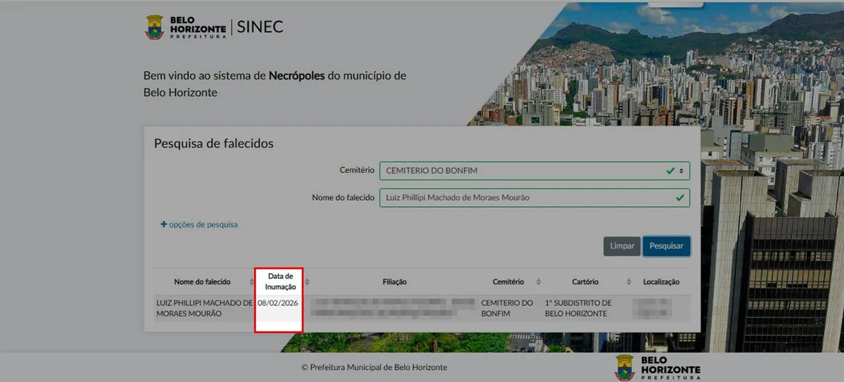 A Prefeitura de Belo Horizonte registrou que Luiz Phillipi Machado de Moraes Mourão, conhecido como “Sicário”, uma espécie de capanga de Daniel Vorcaro, foi sepultado em 8 de fevereiro, quase um mês antes da data oficial do óbito. A divergência apareceu no sistema municipal que informa locais de enterro na capital mineira.