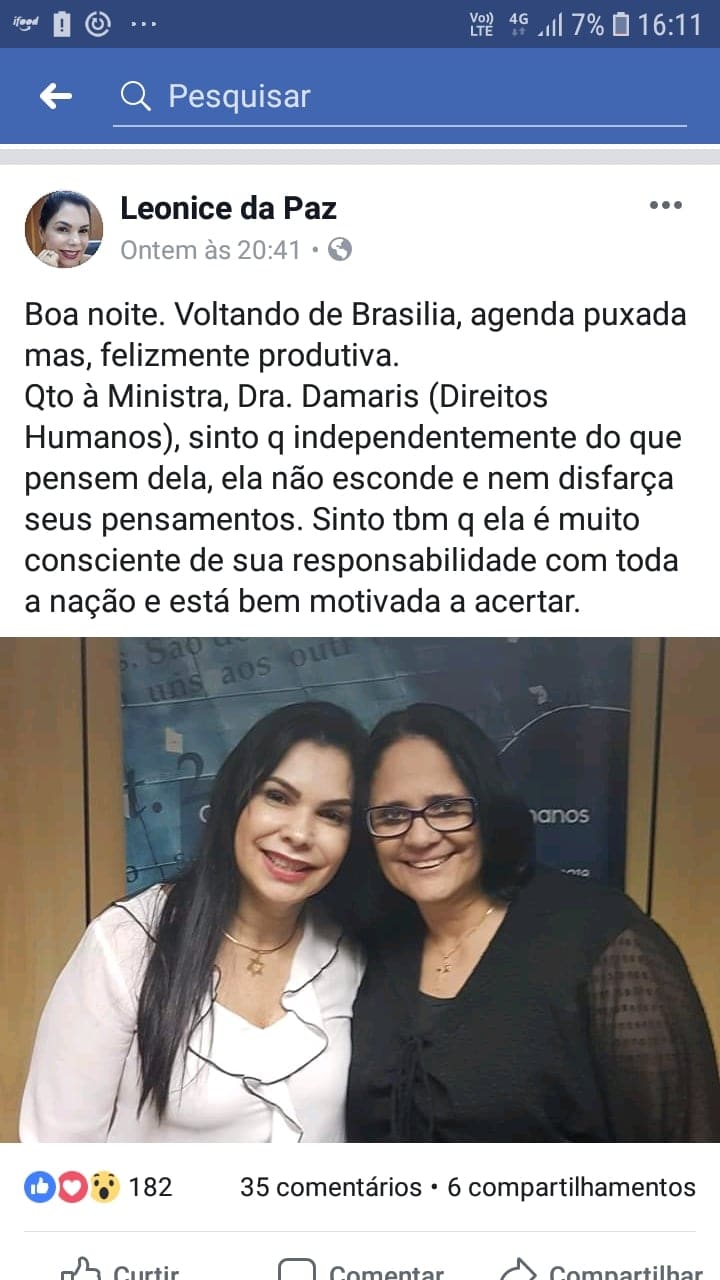 “Conheço a ministra Damares Alves há muitos anos pela militância em movimentos sociais cristãos, em defesa dos direitos humanos, em especial da mulher e da criança. Hoje ambas trabalhamos pelo sucesso do novo governo. Fui vereadora em Campinas por dois mandatos, que dediquei à defesa de meus eleitores, sem qualquer acusação ou resquício de ilicitude de que pudessem me acusar durante minhas legislaturas, mesmo que, para isso, precisasse enfrentar os interesses de poderosos grupos econômicos, que me perseguiram durante minha passagem pelo legislativo.