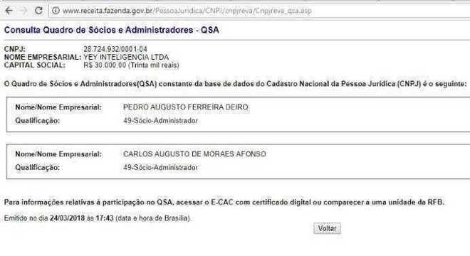 Na Receita Federal, consta que a Yey Inteigência tem sede no Centro de São Paulo e capital social de R$ 30 mil, sendo que o dirigente do MBL possui 75% das cotas.