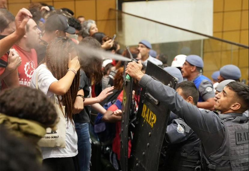 Vídeos divulgados nas redes sociais mostram a polícia usando spray de pimenta e batendo nos manifestantes com cassetetes. Após o episódio, a votação foi retomada sem a presença do público. O projeto foi aprovado com 62 votos favoráveis e um contrário.