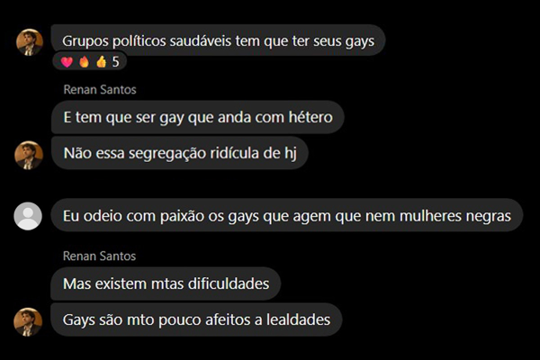 Outro trecho que ampliou a repercussão foi a participação do pré-candidato em conversas ofensivas sobre gays, judeus e mulheres. Em uma das mensagens, escreveu: “Grupos políticos saudáveis têm que ter seus gays. E tem que ser gay que anda com hétero. Não essa segregação ridícula de hoje. Mas existem muitas dificuldades. Gays são muito pouco afeitos a lealdades”.