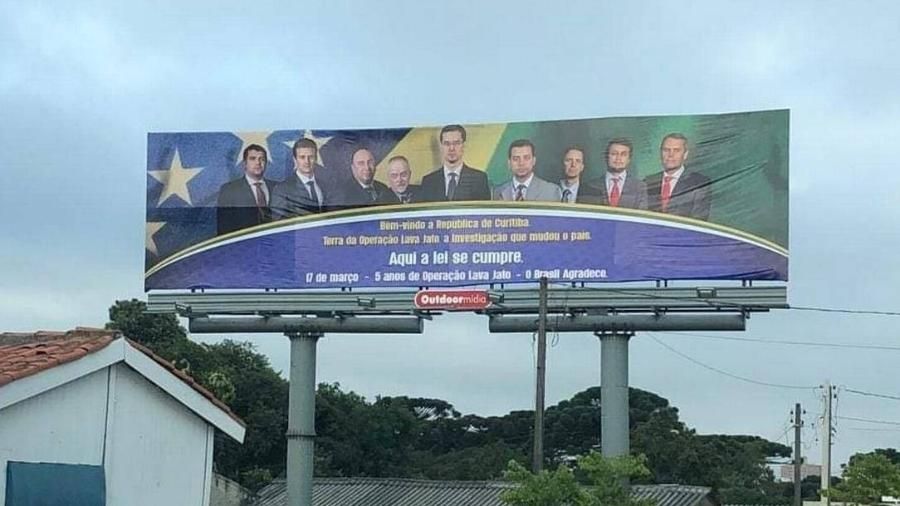 “Bem-vindo à República de Curitiba. Terra da Operação Lava Jato, a investigação que mudou o país. Aqui a lei se cumpre. 17 de março — 5 anos de Operação Lava Jato — O Brasil Agradece”.