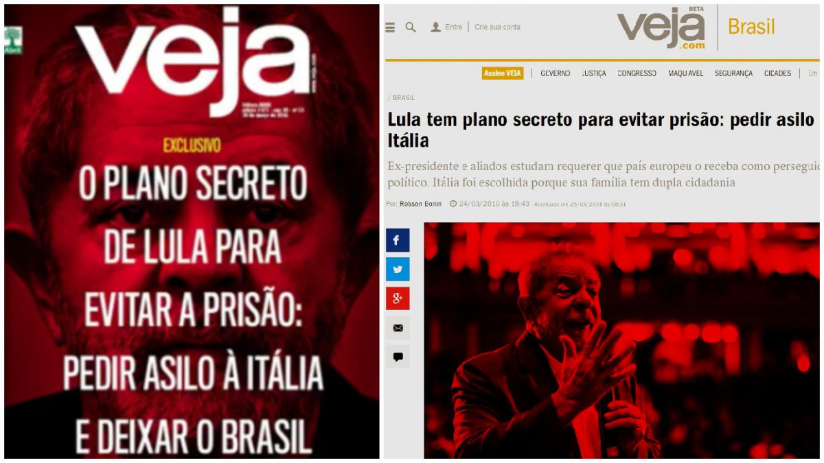 Curiosamente, Veja tem sido uma das maiores produtoras de notícias falsas nos últimos anos. Basta citar suas reportagens recentes sobre “dólares de Cuba”, “dólares de Khadafi” e até sobre um mirabolante “plano de fuga” do ex-presidente Lula para a Itália, que poderia ser usado para motivar uma eventual prisão preventiva. A prática tem sido tão escancarada que, nas últimas eleições presidenciais, Veja foi obrigada pela Justiça Eleitoral a conceder direito de resposta à presidente deposta Dilma Rousseff, no dia do segundo turno.