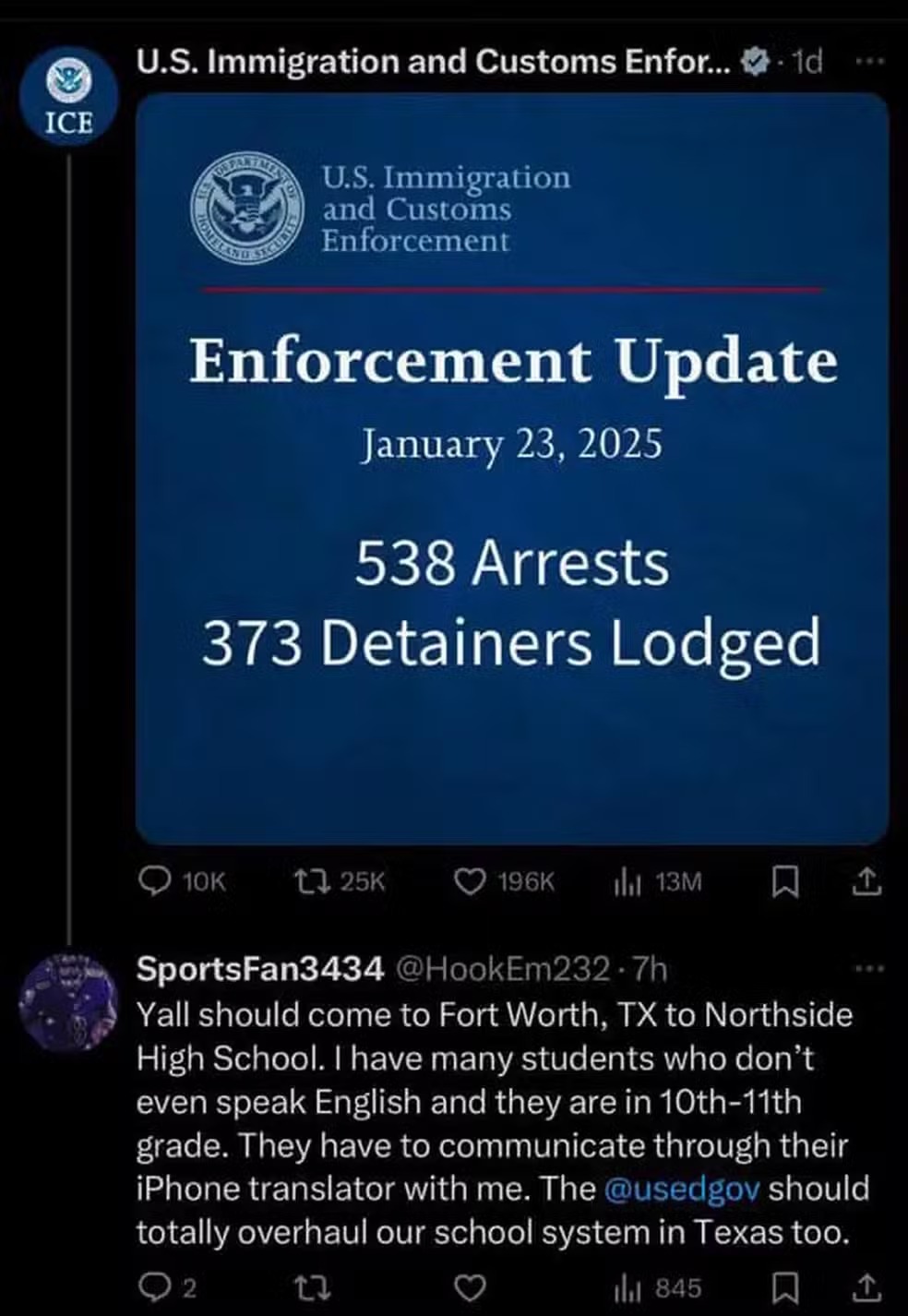 Professor denunciando alunos de escola no Texas em post da ICE. Foto: Reprodução/X