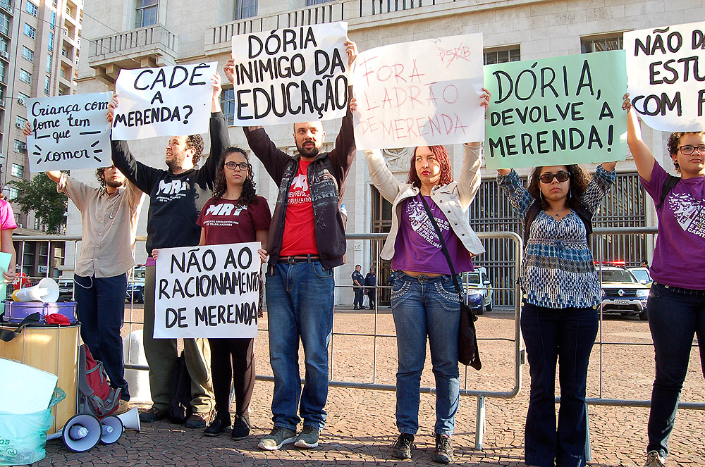 Na tarde desta quarta-feira um grupo de professores, mães e pais de alunos e representantes de movimentos sociais esteve em frente ao edifício da prefeitura de São Paulo em protesto contra o racionamento da merenda nas escolas públicas municipais. Estavam todos indignados tanto com a medida como com o modus operandi nefasto de marcar as crianças que já tenham pegado a refeição uma vez no intuito de que não repitam o prato.
