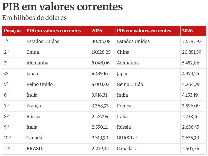De acordo com o FMI, “espera-se que a guerra tenha um pequeno efeito líquido positivo em 2026, devido ao fato de o país ser um exportador líquido de energia, impulsionando o crescimento em cerca de 0,2 ponto percentual”. Essa previsão é uma das principais razões que colocam o Brasil de volta ao Top 10 global, ao ultrapassar o Canadá, que em 2025 ocupou a 10ª posição.