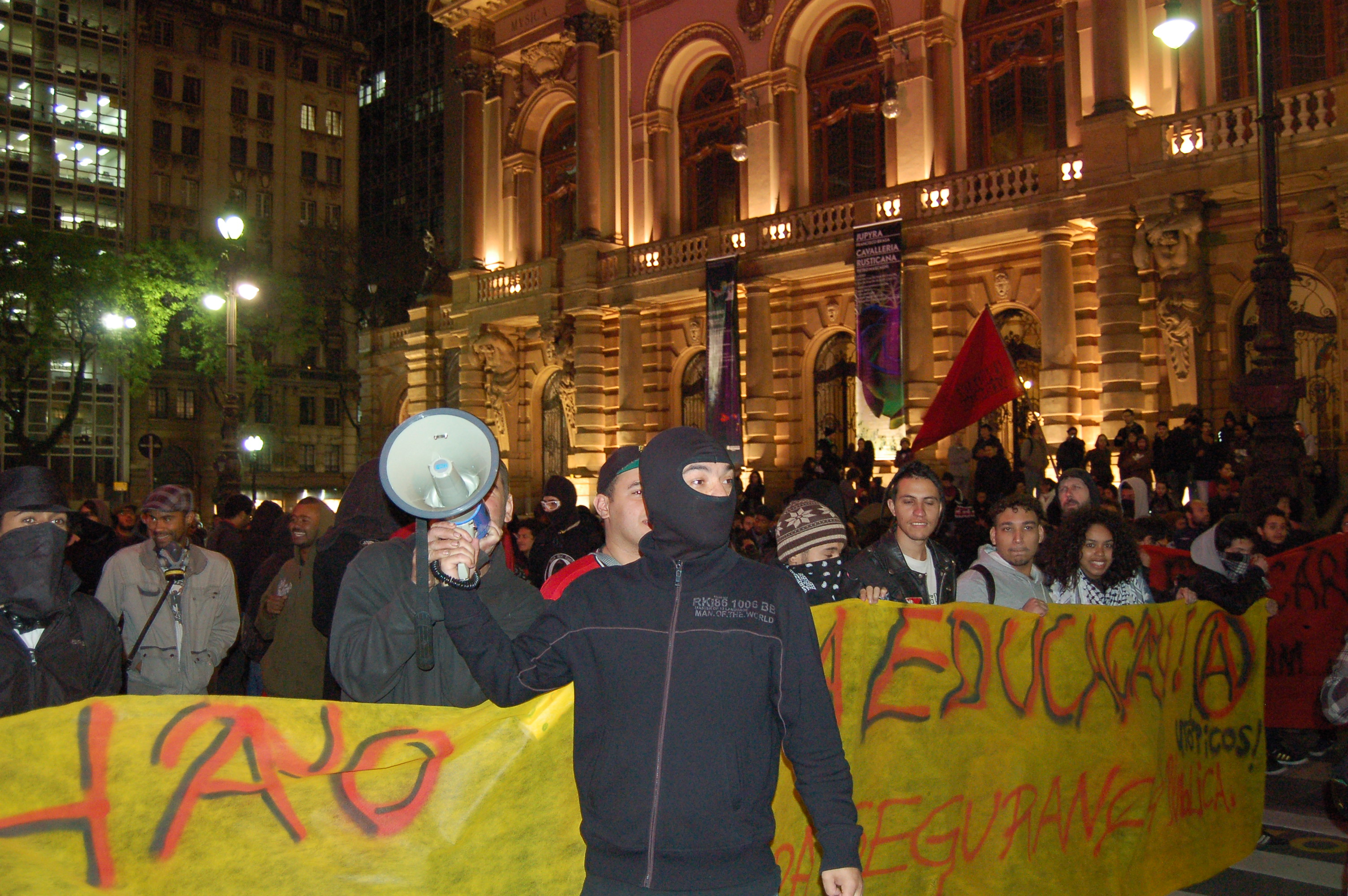 Uma partiu do vão livre do MASP, repleta de professores. A outra deu largada em frente ao Teatro Municipal, na praça Ramos de Azevedo, também com professores integrando o bloco, mas acompanhada de centenas de black blocs.