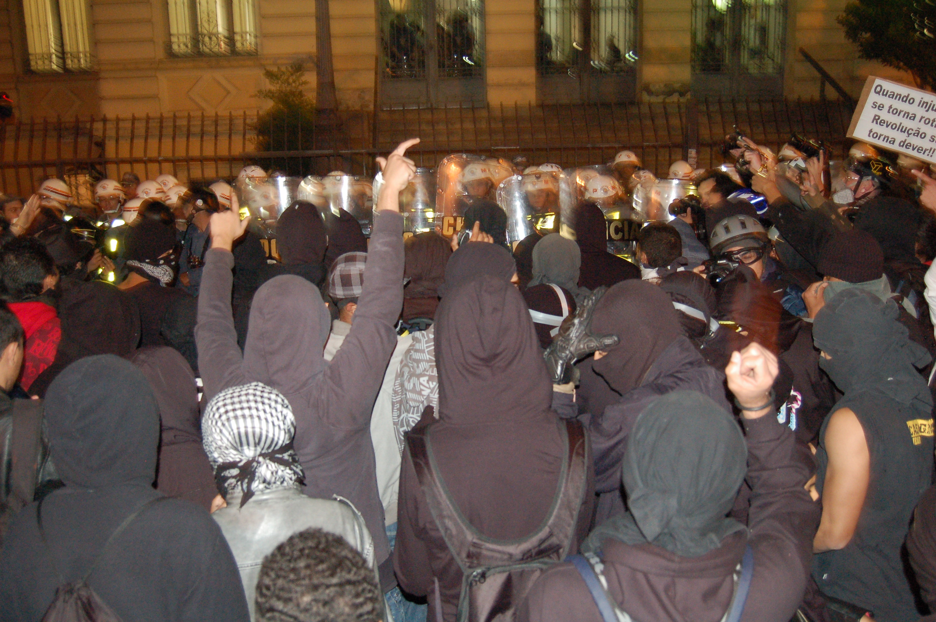 As manchetes de TV ao final da manifestações são padronizadas em: “Acabou em quebra-quebra agora há pouco…”, banalizando o ato, reduzindo-o à baderna. Na data de hoje, não poderei acusar a Globo de sensacionalismo caso ela faça isso. Foi assim mesmo que terminou e era esse mesmo o combinado entre as partes.