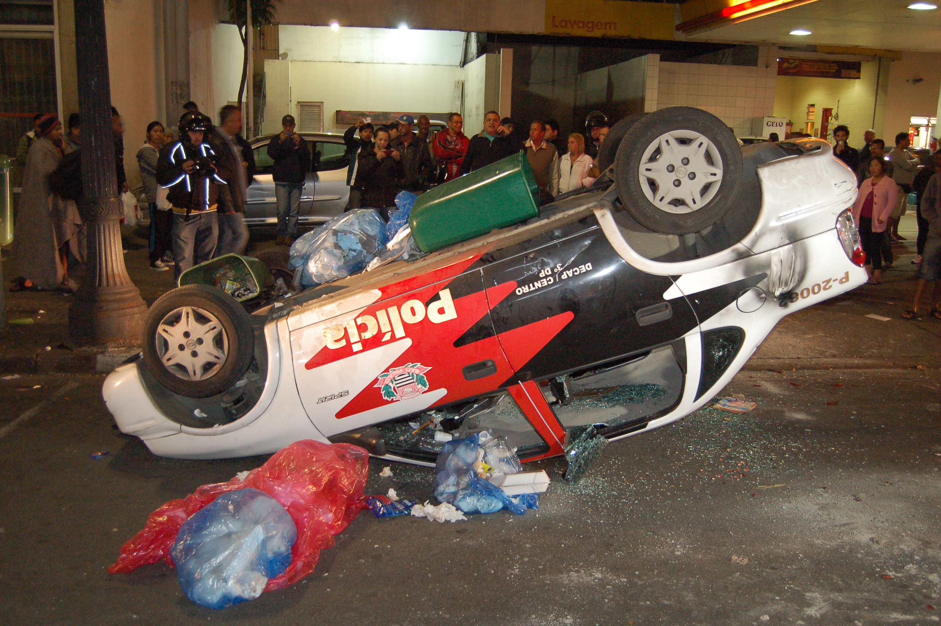 Próximo ao 1º Distrito Policial, uma viatura foi atacada, depredada e virada por manifestantes. Para não deixar barato, a PM continua mirando indiscriminadamente e, pela segunda vez, tive o pé atingido por uma bomba (nada grave, apenas uma quebra da unha).