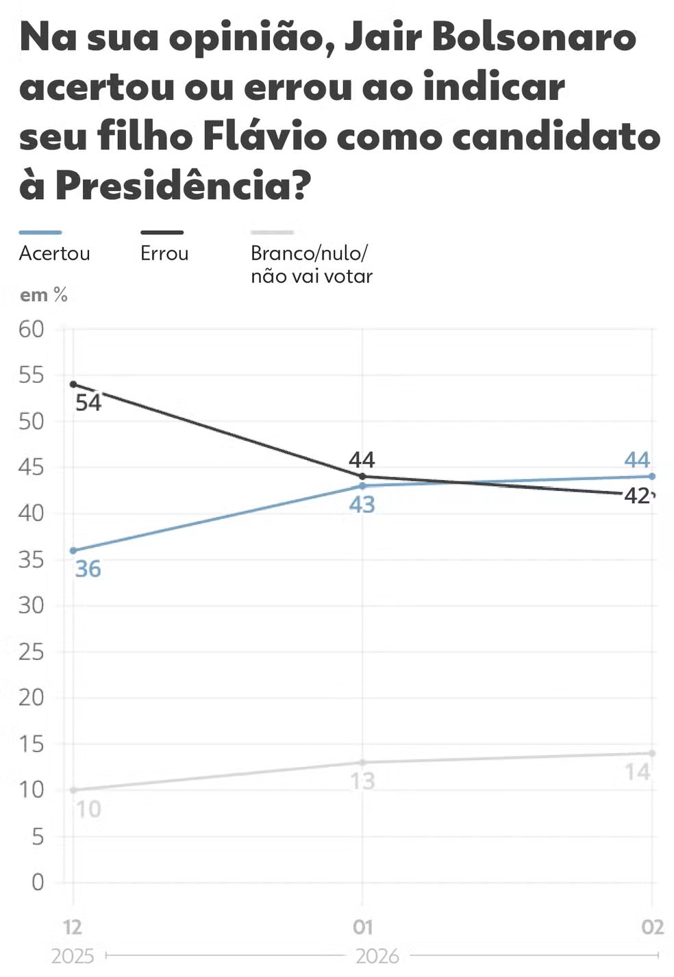 Os números sugerem que a consolidação da pré-candidatura de Flávio é conhecida por parcela majoritária do eleitorado. A visibilidade do apoio paterno aumentou sete pontos percentuais em relação ao mês anterior.